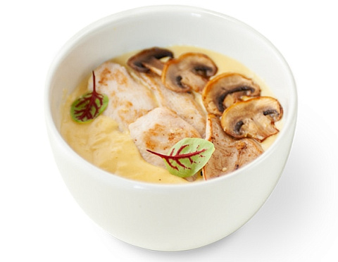 Бульон WOK, сыр чеддер, сыр творожный, сыр пармезан, сливки, мука, шампиньоны, филе цыплёнка.