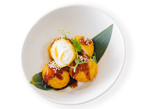 Рис, сливочный сыр, сыр чеддер, сухари панко, соус Терияки.