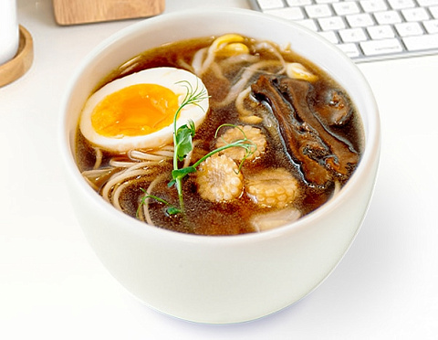 Яичная лапша, бульон Суймоно, яйцо маринованное, грибы шиитаки, мини кукуруза, соевые ростки, лук репчатый