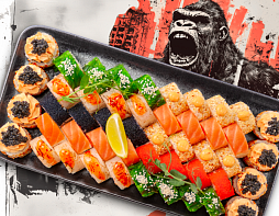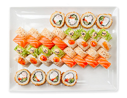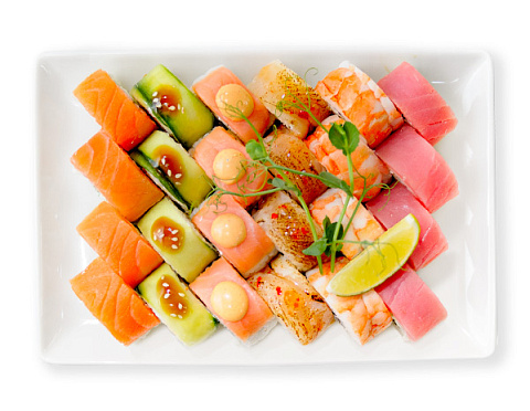Лосось, сливочный сыр, авокадо, огурец, кунжут белый.Креветка, сливочный сыр, огурец, зелёный лук, икра масаго.Лосось, огурец, сливочный сыр. Окунь темпура, огурец, кра...
