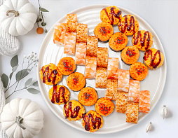 Копченый лосось, темпура, лосось жареный в соусе Терияки, майонез.