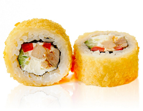 Лосось, огурец, сливочный сыр, соус Спайси, кунжут Ким-Чи, соус Терияки, рис, кляр, сухари Панко