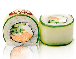 Морской окунь, сливочный сыр, огурец, соус Чили.