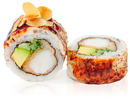 Угорь, креветка в темпуре, огурец, авокадо, соус унаги, хлопья миндаля