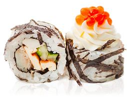 Лосось, креветка, тунец, крабовые палочки, майонез, икра масаго, соус унаги, рисовые шарики, соус кр...