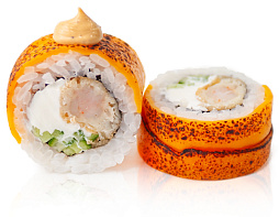Креветка темура, огурец, сливочный сыр, сыр чеддер, соус гриль