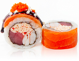 Лосось, креветка, тунец, крабовые палочки, майонез, икра масаго, соус унаги, рисовые шарики, соус крем-васаби