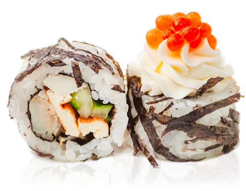 Окунь жареный , тамаго, огурец, сливочный сыр, имитация икры