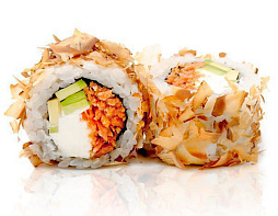 Сом, копчёный лосось, сливочный сыр, соус Спайси, огурец, икра масаго, кунжут черный.