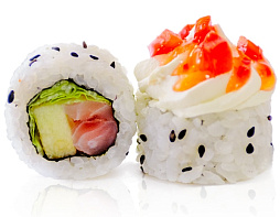 Жареный лосось, сливочный сыр, соус Терияки, авокадо, хлопья тунца