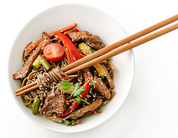 Вырезка говяжья, цукини, лук красный, морковь, перец болгарский, масло чесночное, лапша гречневая, бульон вок, соус вок, томат черри, кунжут белый, ростки соевые, микрозе...